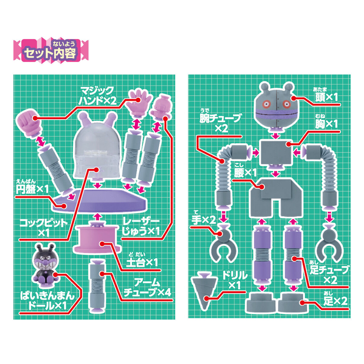 さらに、チューブの曲げ伸ばしをしたり、吸盤で組み替えたりすることで、自分だけのバイキンメカを作って遊ぶことができます!