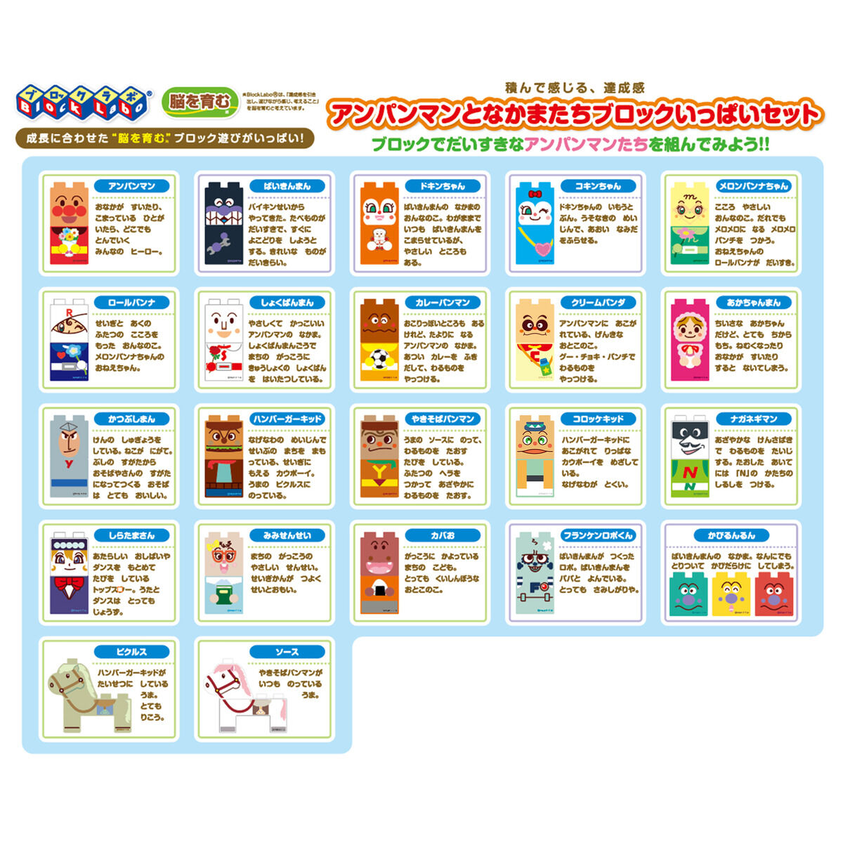 アンパンマン、ばいきんまん、ドキンちゃんたちはもちろん、みみせんせいやカバおなどのまちのなかまたちや、やきそばパンマンとソース、ハンバーガーキッドとピクルスなど、人気のキャラクターが全22体! 定番の正方形や長方形ブロック、動物、木などお子さまの想像力が広がるブロックもたっぷり55ピース入り!