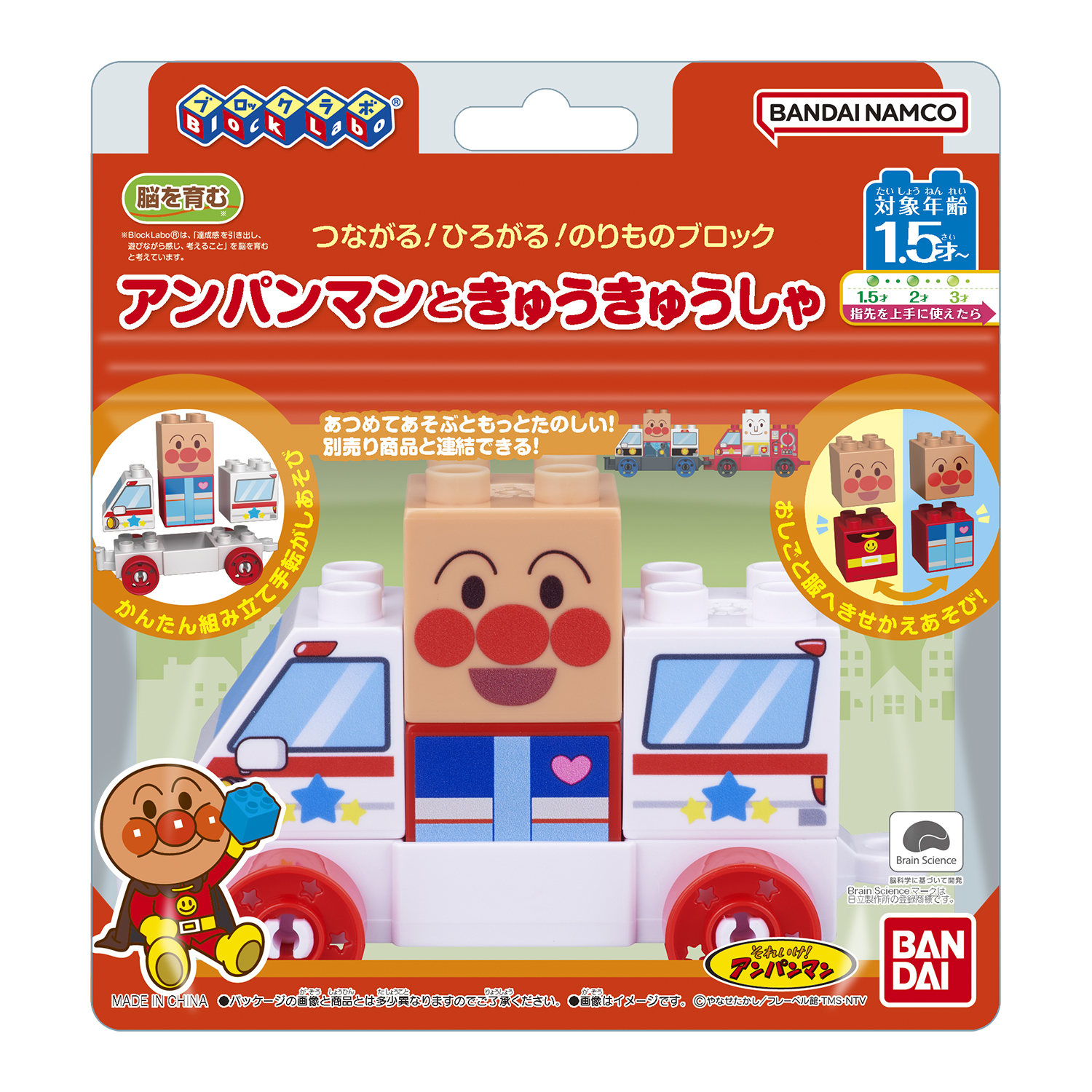 小さなお子さまでも簡単に組み立てて、手転がし遊びができるアンパンマンと救急車のブロックセットです。