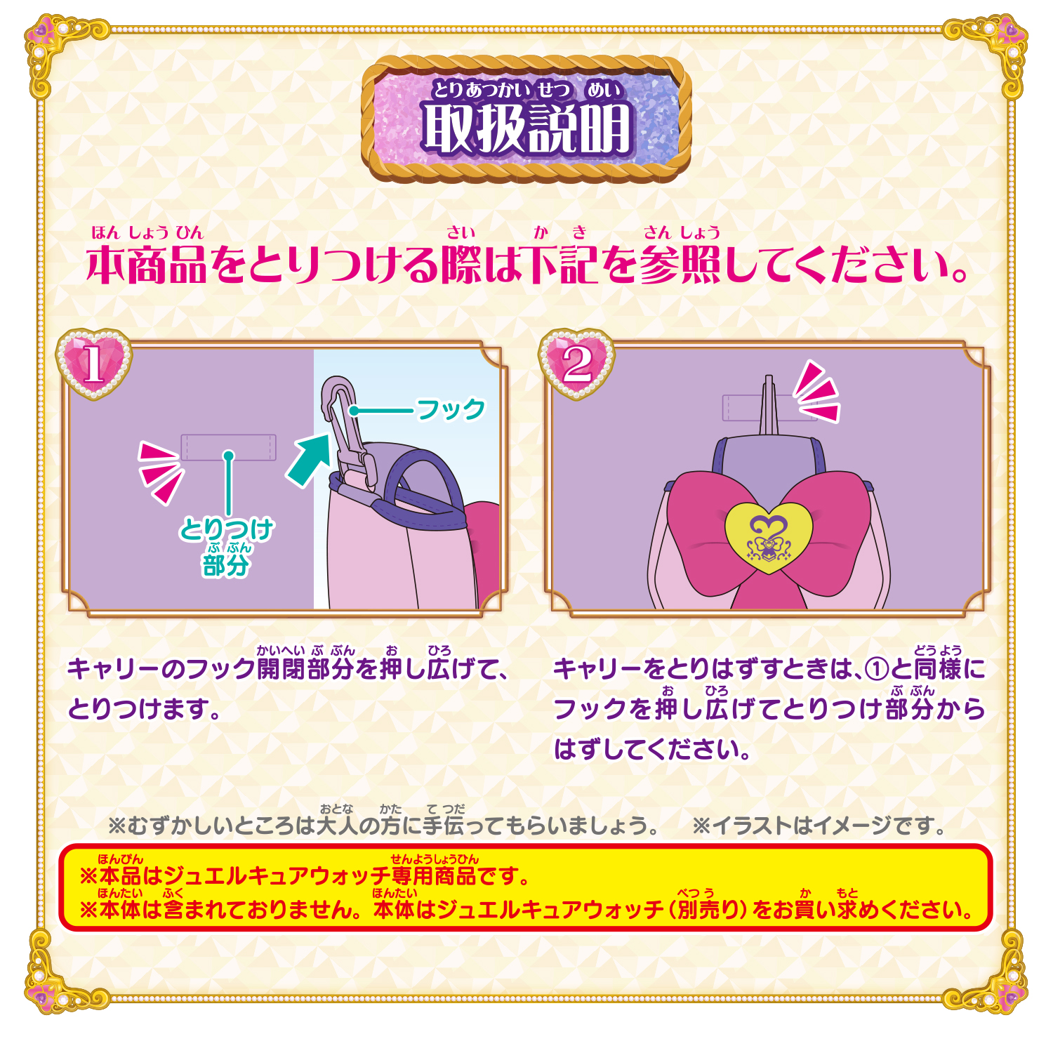 別売りの「くるっと変身! ジュエルキュアウォッチ」を腰につけることができる専用キャリーです。