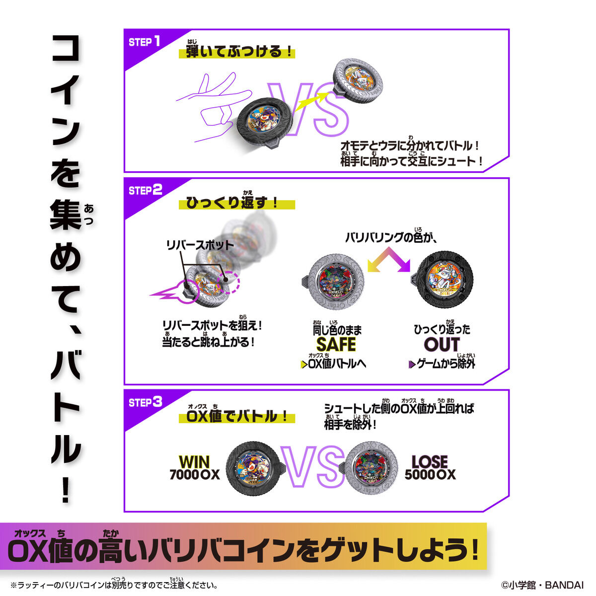 全種両面デザインで多種多様な「バリビィ」の姿を楽しむことができるほか、コイン同士を弾いてぶつけ合い、コインを裏返すことで勝敗を決めるバトル遊びもできます。