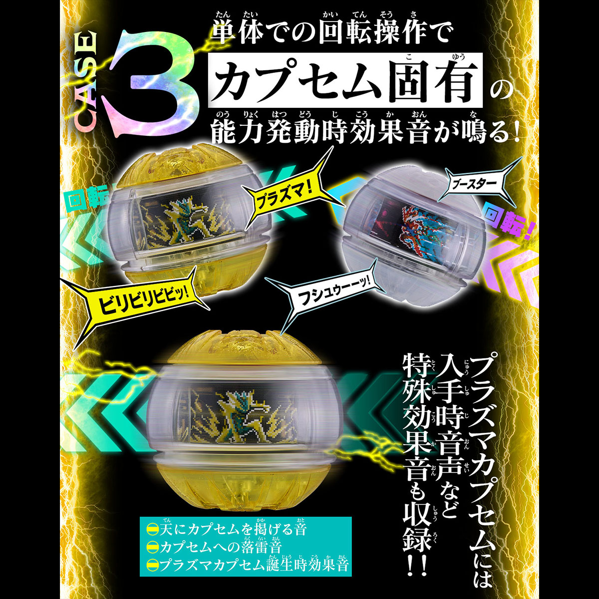 本商品は通常DX版同様に、別売りの「DXゼッツドライバー」と連動が可能。ドライバーにカプセムをセットして回転させることで、ドライバーから鳴る変身音に合わせてカプセムから追加効果音が発動します。また「プラズマカプセム」使用時には、変身時にボタン操作で「雷を帯びたフィンガースナップ音」も発動可能。「ブースターカプセム」使用時には、「噴き出る排気音」など固有の音声が発動します。さらに必殺技操作時も、必殺技後の追加効果音が発動します。