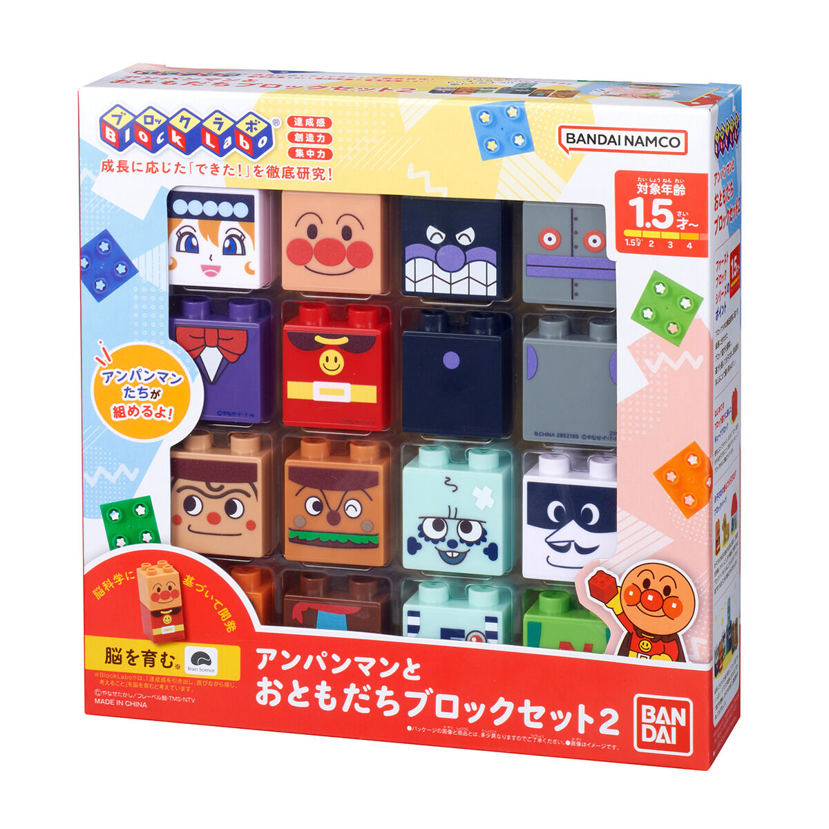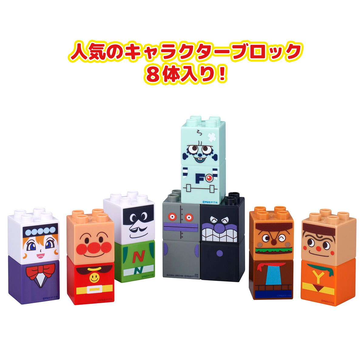 定番のアンパンマンとばいきんまんに加えて、人気のだだんだんやフランケンロボくん、しらたまさん、ナガネギマン、ハンバーガーキッド、やきそばパンマンが入ったキャラクターブロックセットです。はじめてのブロックバケツやブロックワゴンと遊べばさらに楽しめます。