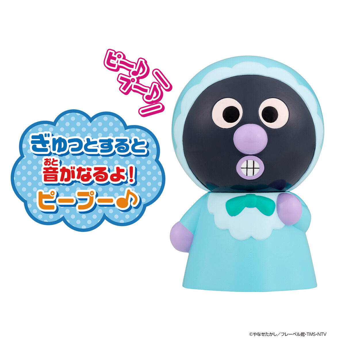 「それいけ!アンパンマン」に登場する「あかちゃんばいきんまん」の首が可動する、お人形のおもちゃです。ソフビ製で手のひらサイズ(約8.7cm)なので、軽くて握りやすく低年齢のお子様にも遊びやすいです。鳴き笛としても楽しめます。