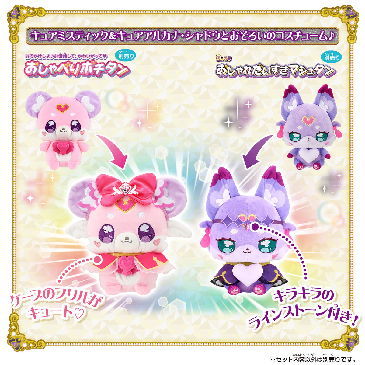 別売りの「おでかけしよ♪お世話して、かわいがって♥おしゃべりポチタン」と、「占って♥おしゃれだいすきマシュタン」に着せられる、キュアミスティック&キュアアルカナ・シャドウとお揃いのコスチュームです。
