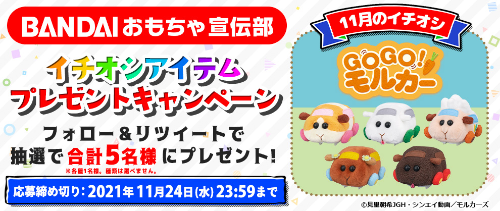 株式会社バンダイ(以下「当社」といいます)の「バンダイおもちゃ宣伝部イチオシアイテムプレゼントキャンペーン(11月)」(以下「本キャンペーン」といいます)の応募に際しては、下記のキャンペーン概要・注意事項をよくお読みいただきますようお願いいたします。本キャンペーンに応募された場合には、本利用規約に同意されたものとみなし、本応募規約や本キャンペーンの運営方法について一切異議等を申し立てないものとします。