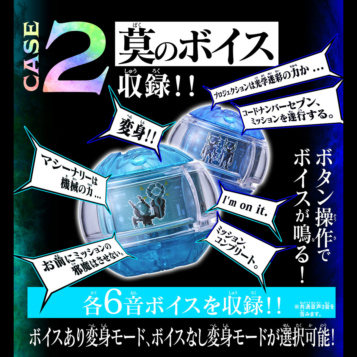 第三弾の本商品には、「マシーナリーカプセム」と「プロジェクションカプセム」をラインナップ。通常DX版と同じ本体サイズ内に電子部品を搭載しています。新たに搭載されたボタンを操作することはもちろん、カプセム特有の回転ギミックを検出するスイッチも搭載し、様々なアクションでカプセム本体から音声を発動することが可能となりました。音声モードは切り替えが可能で、カプセム固有の能力効果音が発動可能な「変身前モード」、変身時の効果音が発動可能な「変身モード(ボイスなし)」、変身時の効果音に合わせて万津莫(演:今井竜太郎)のボイスが鳴る「変身モード(ボイスあり)」の3種が搭載されています。