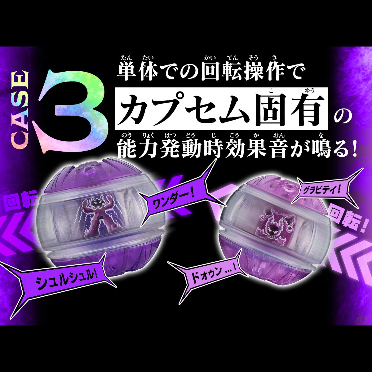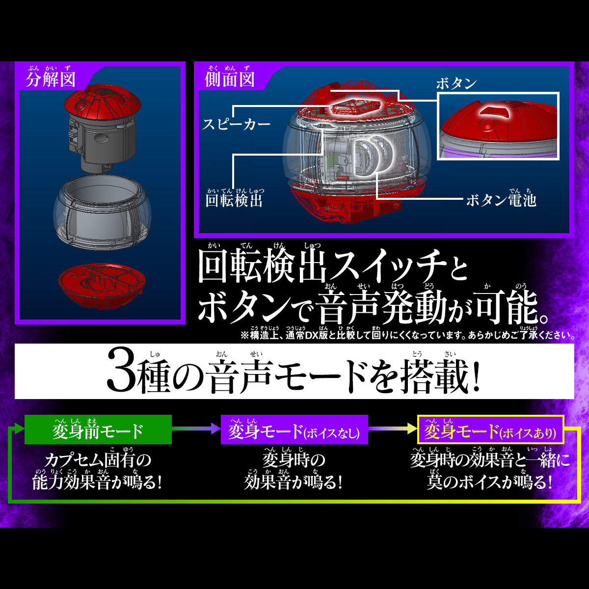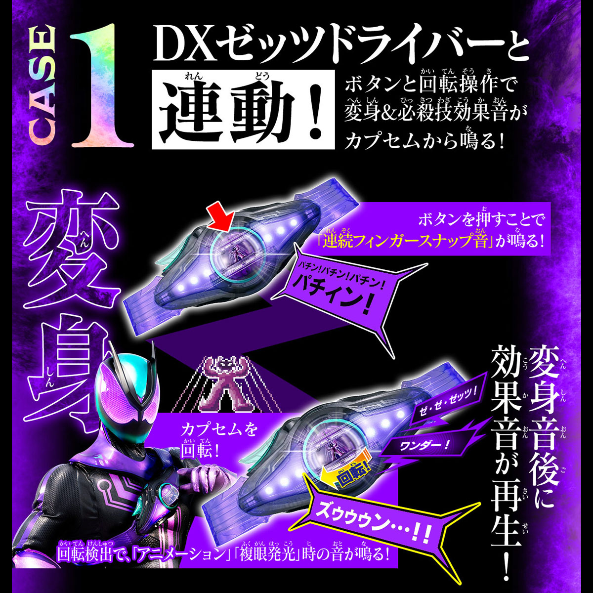 This fifth installment in the "DX Sound Rider Capsume Series" includes the "Wonder Capsume" and "Gravity Capsume." The electronic components are housed within the same dimensions as the standard DX version. In addition to the newly added buttons, the Capsume also features a switch that detects the Capsume's unique rotation mechanism, allowing various actions to activate sounds from the Capsume itself. The sound modes are switchable, with three options: "Pre-transformation Mode," which activates the Capsume's unique ability sound effects; "Transformation Mode (without voice)," which activates the transformation sound effects; and "Transformation Mode (with voice)," which plays the voice of Manzumo (played by Ryutaro Imai) along with the transformation sound effects.