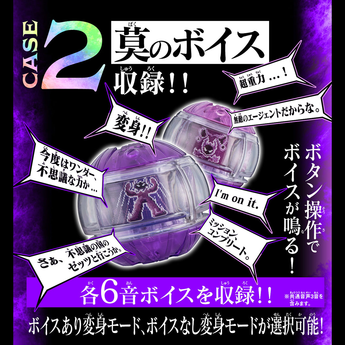 This product also includes the character voice of the main character, Manzumo. Each Capsule contains six sounds, including three common sounds, allowing you to enjoy NARIKIRI-playing along with the voice just before transformation and memorable lines from the show. Furthermore, by rotating the Capsule in "pre-transformation mode," the sound effect of the unique ability is activated. In addition, the Wonder Capsule also includes background music. Two insert songs, "WONDER" and "Impossible Dream," can be played.