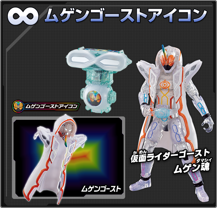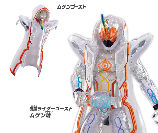 ムゲン魂に変身!ゴーストの究極パワーアップフォーム、七色にきらめく光のボディは、無限の可能性を秘めているぞ!