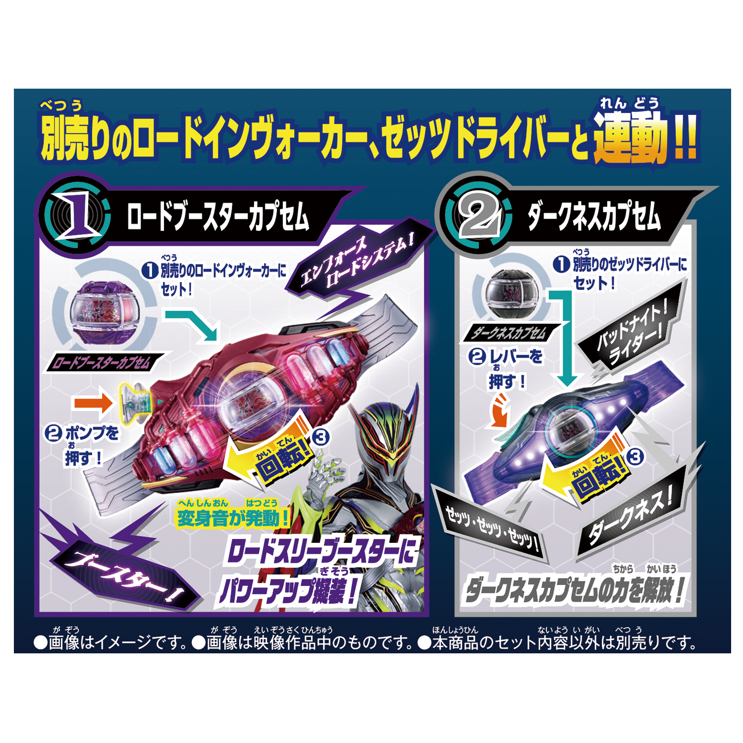 來自《幪面超人Z》的「DX RIDER CAPSEM SET 05」現已發售!此套裝包含Road Three用來強化自身力量的「Road ブースターカプセム」和「Darkness膠囊」。