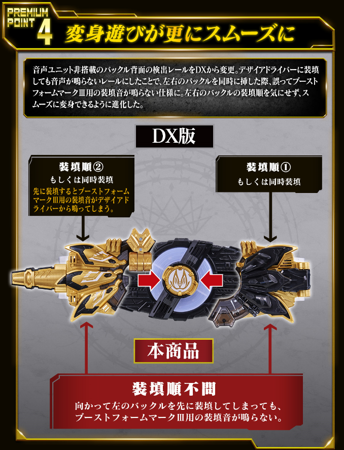 この変更により、変身遊び中に時々起きていた「装填タイミングによっては、ブーストフォームマークⅢ用の装填音が聞こえる」問題を解決しております!
