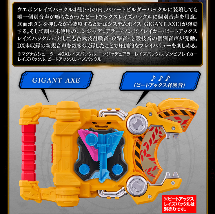 底面ボタンを押しながら何かしらの小型バックル(ウエポンバックル以外)を装填したら、ビートアックス用装填音が聞けます。