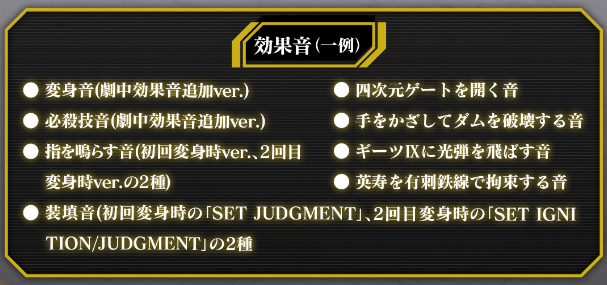 未来の英寿の「ハァッ!」等の掛け声有りver.と無しver.の2種類を収録いたします。メモリアルブーストマークⅨ、メモリアルブジンソードバックルでも掛け声付きの必殺技音は好評でしたのでその流れを汲み、共に収録いたします!