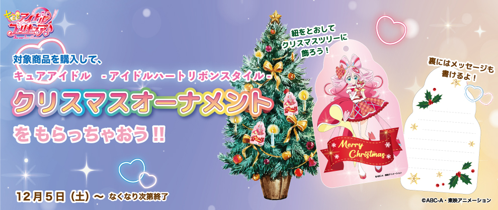 2025年12月6日(土)より、対象商品をお買い上げで「キュアアイドル‐アイドルハートリボンスタイル‐デザインの紙製クリスマスオーナメント」がもらえるキャンペーンがスタート♪